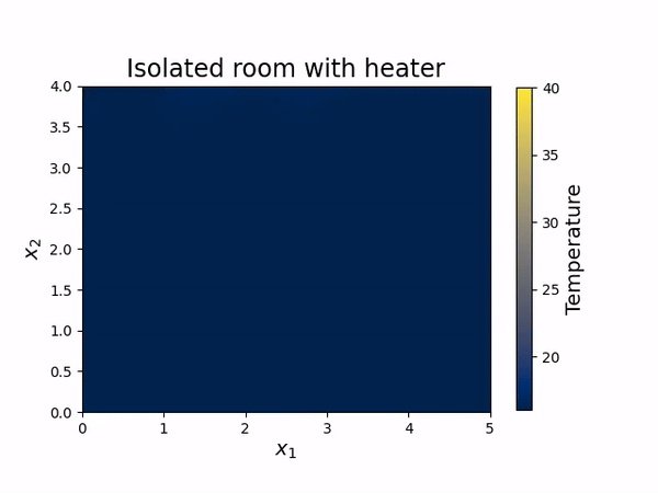 Part B) Time-dependent, two-dimensional heat equation is solved for a perfectly isolated room with a heater turned on (animation on the right). Click here to open the Jupyter Notebook. It contains: